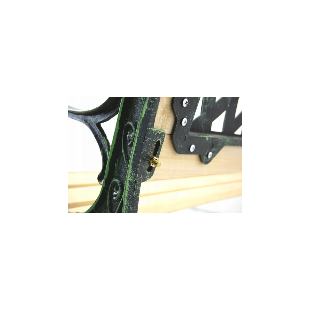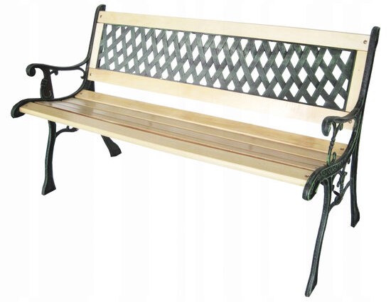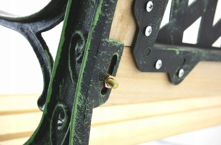 A háttámla  -t imitáló műanyagból készült; öntöttvas és fa.