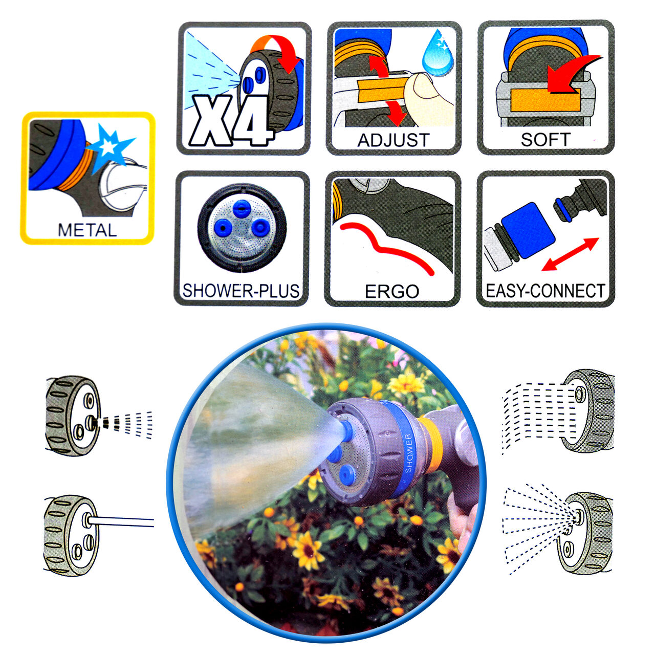 Kerti szórópisztoly, zuhany típusú, 4 utas, fémes, Aquacraft