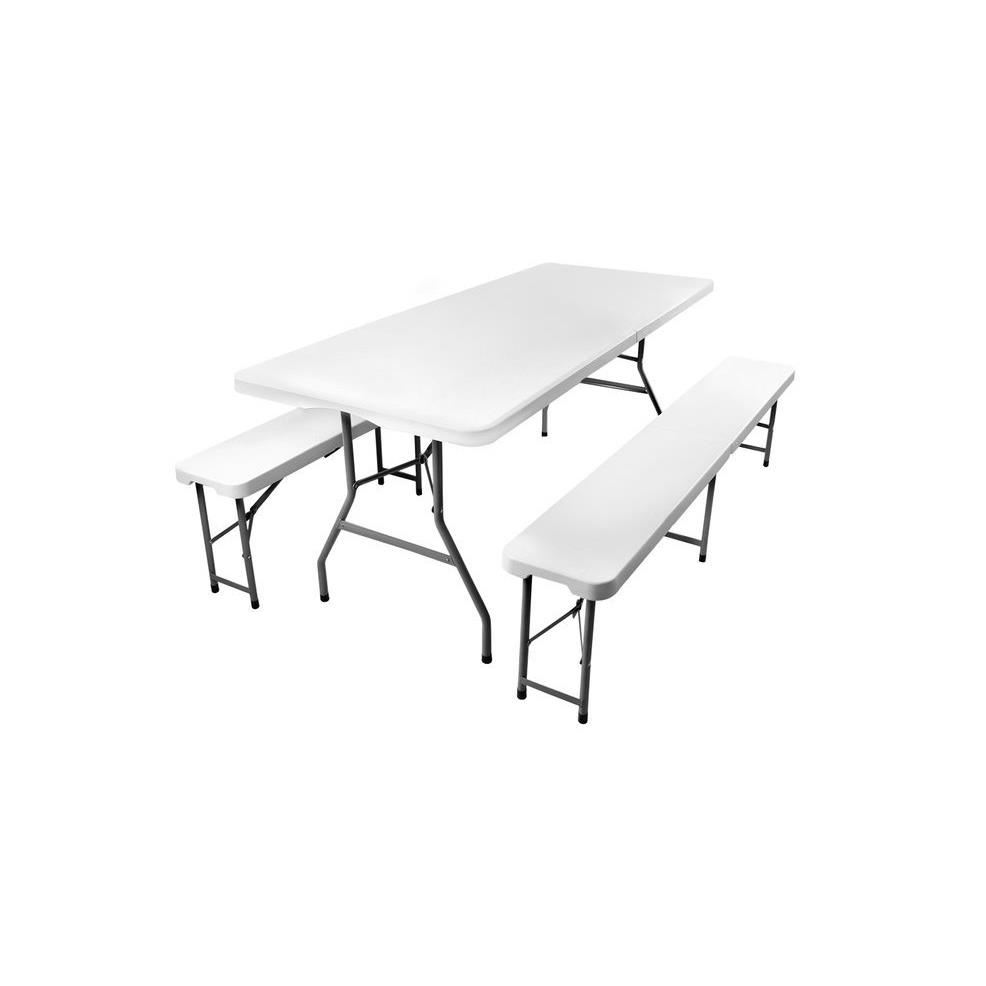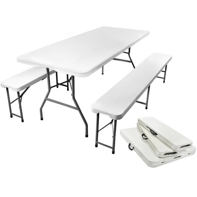 Kerti / terasz bútor garnitúra, összecsukható, 1 asztal, 2 pad, fehér, 180x74x74 cm / 180x30x45 cm, Malatec