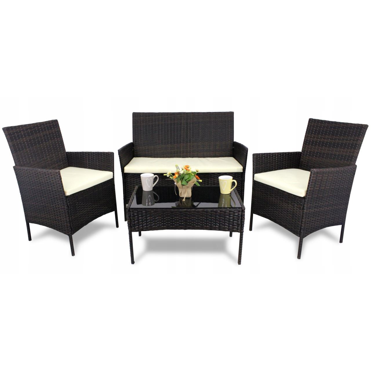 Kerti / terasz bútor garnitúra, poliratan, barna, krém párnákkal, 1 asztal, 2 fotel, 1 kanapé, Medi A kerti bútor tökéletes a klasszikus ...
