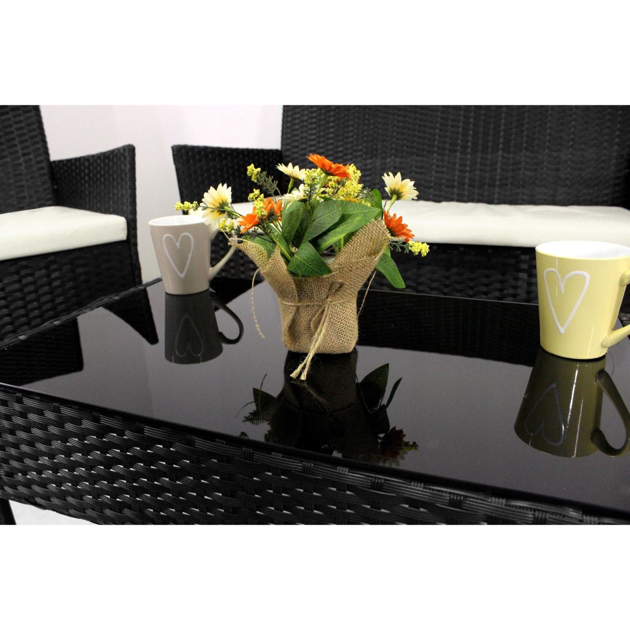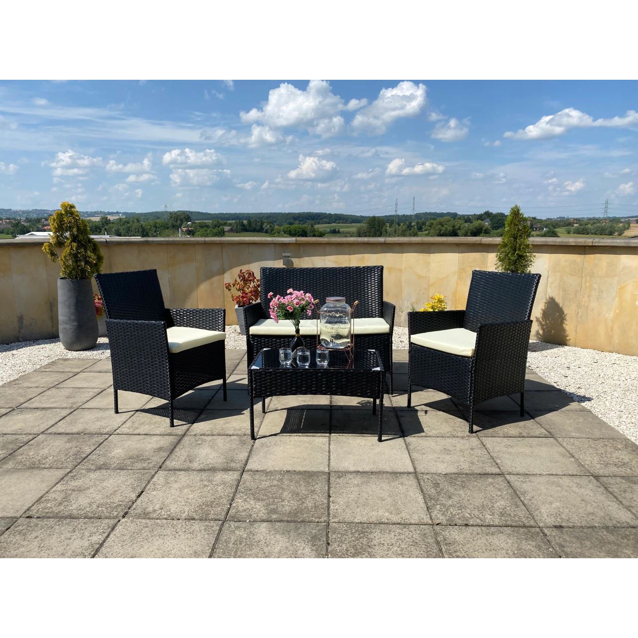 Kerti / terasz bútorkészlet, poliratan, fekete, bézs párnákkal, 1 asztal, 2 fotel, 1 kanapé, Medium