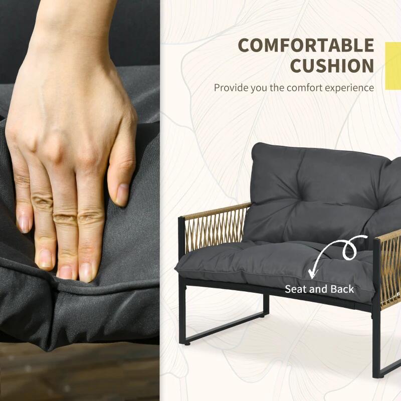 - Ez a bútorkészlet 100%-ban készen áll a kültéri használatra, mert minőségi anyagokból készült. A csomag minden darabjának szerkezete rozsda- és időjárásálló acélból készült. Ezenkívül a székek karfáit és a kanapét polietilén háló díszítette, amely hűen utánozza a rattant. Ez a fonat nem fog elszíneződni az idő múlásával, és nem deformálódik, ha bő vízzel vagy erős UV-sugárzással érintkezik. Az ülések és párnák poliészterből készültek, amely sikeresen megbirkózik a nedvességgel és a foltokkal.