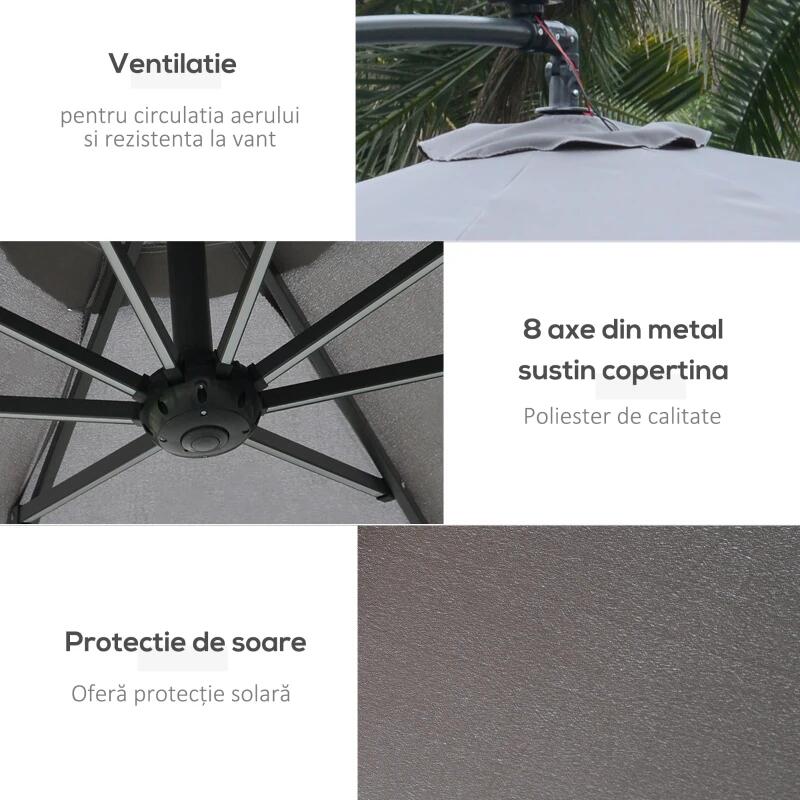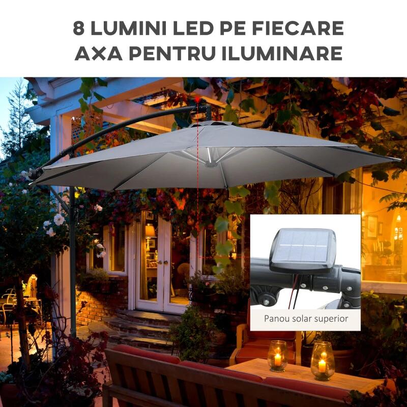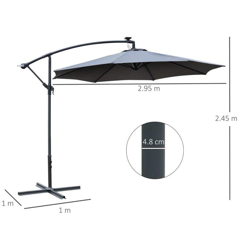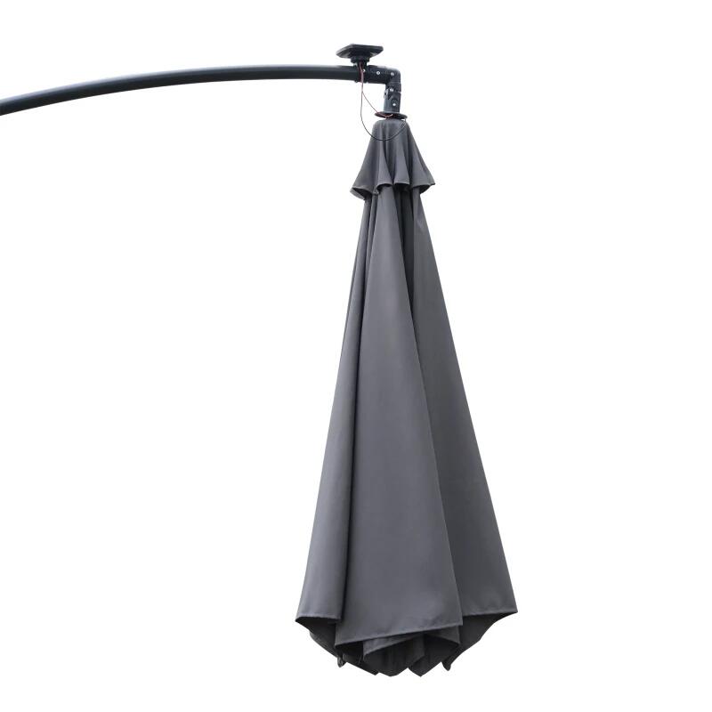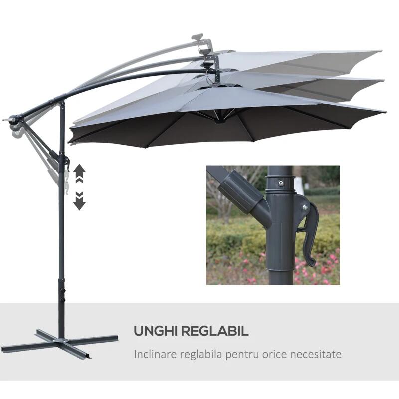 Kerti/terasz esernyő napelemmel, LED világítás, banáncsatlakozó, fogantyú, szürke, 295 cm