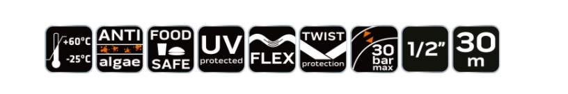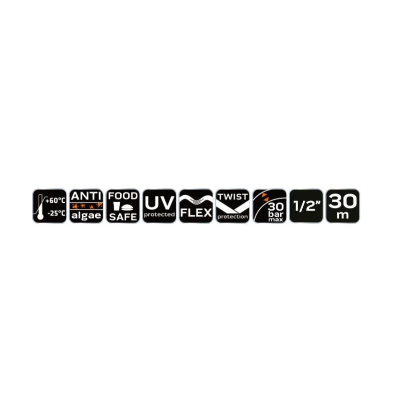 A tömlő ellenáll az algásodásnak és az UV sugárzásnak, élelmiszerekkel való érintkezésre is alkalmas a Food Safe réteg miatt.