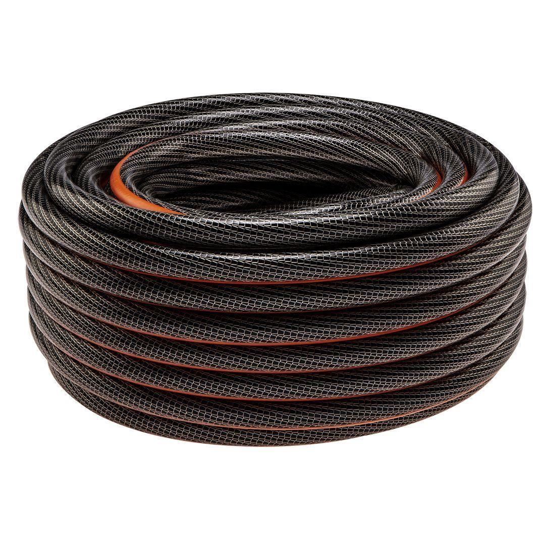 A 6 rétegű kerti tömlő rugalmas PVC-ből készült, poliészter szálakkal megerősítve, két fonattal (kereszt és kötött).