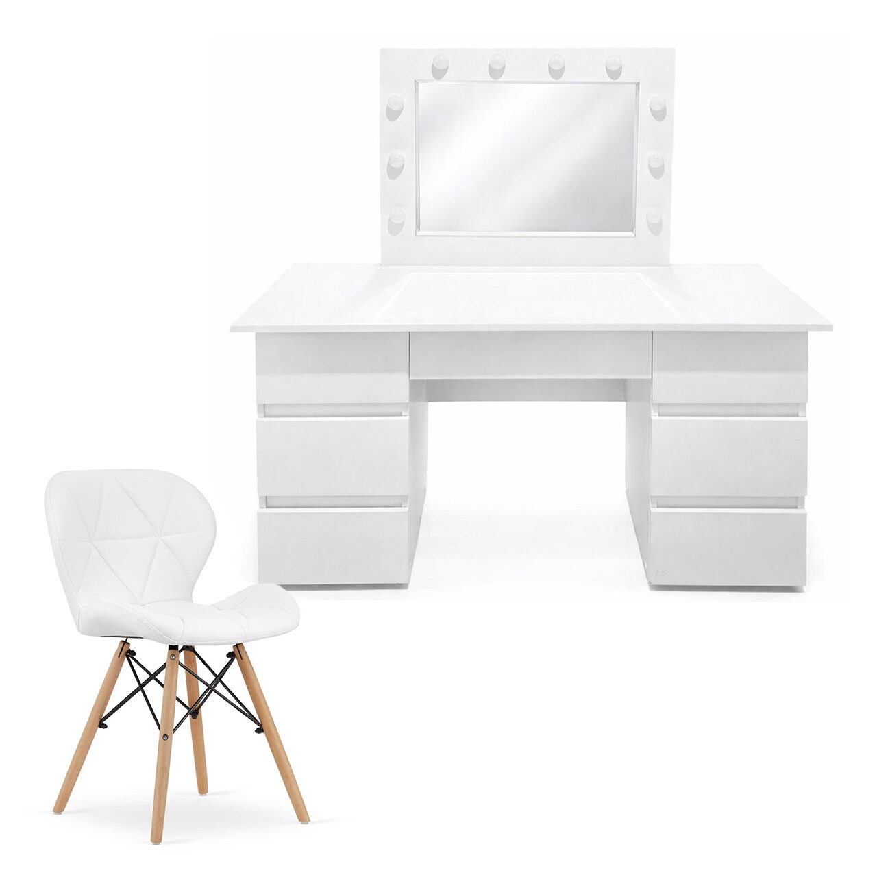Masa de toaleta/machiaj, Vanessa + scaun Lago, alb, cu oglinda si LED-uri, 130x43x143 cm (146210)