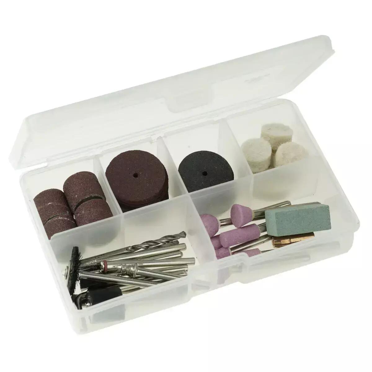 - A készlet 40 darab kiegészítőt tartalmaz a darálóhoz, tökéletesen elrendezve egy speciális készletben.