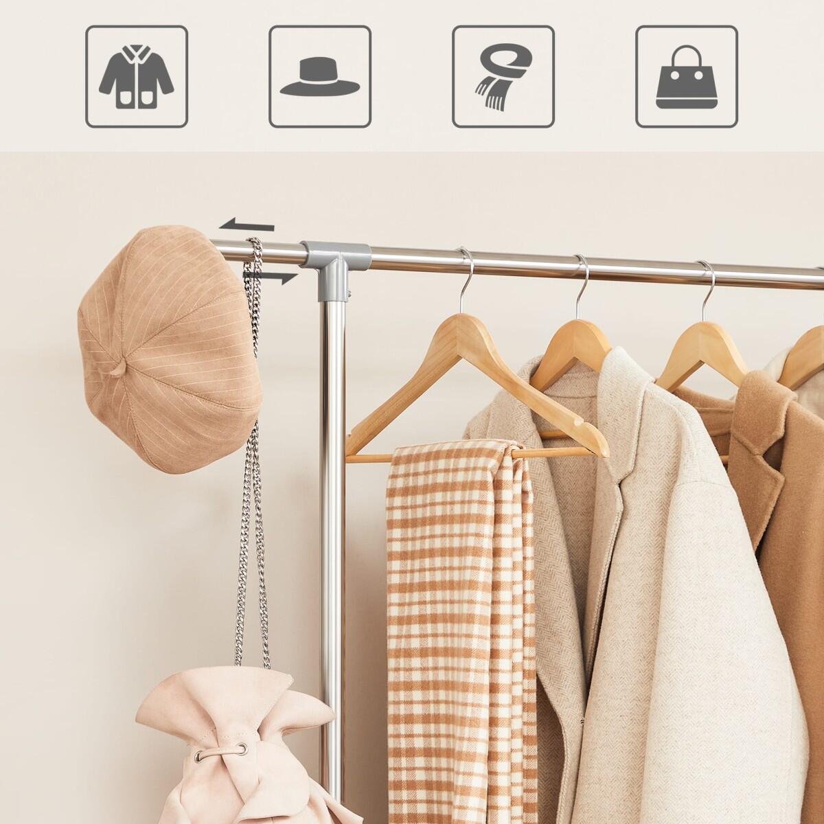 - A rúd hosszának, de a támaszték magasságának beállításának lehetősége további helyet biztosít a ruhák felakasztására.