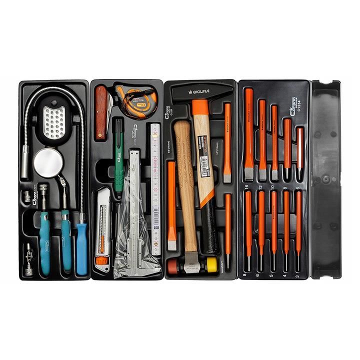 Mobil szerszámos szekrény, 7 fiókkal,  -t tartalmaz; 5 fiókot   sorozattal; változatos de szerszámokból, kiváló minőségű anyagokból, profi készlet.
