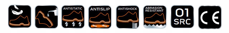 - Védelmi osztály: O1 (csúszásmentes talpú cipő, antisztatikus, zárt sarokvédő terület, ütéselnyelés a sarok területén)