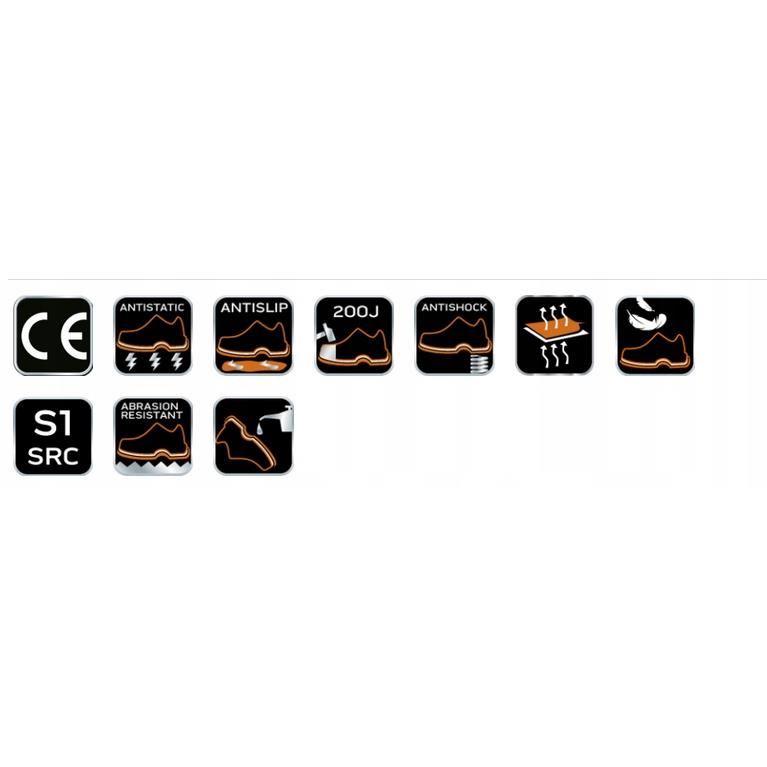 - Védelmi osztály: S1 (ütésálló orr, csúszásmentes talp, zárt saroktakaró terület, energiaelnyelés a sarok területén és antisztatikus tulajdonságok)