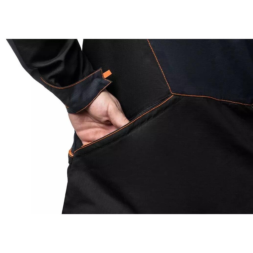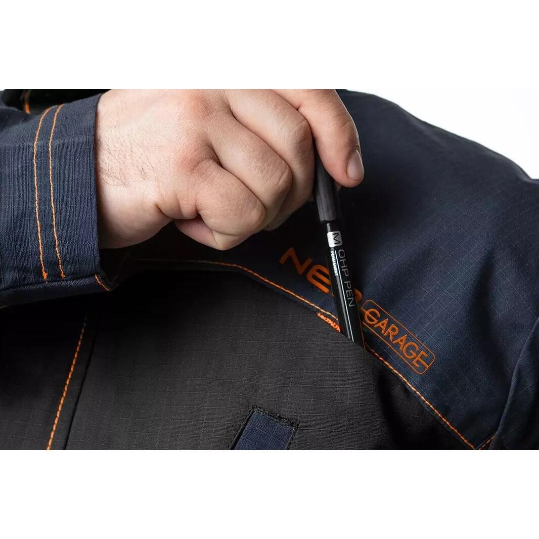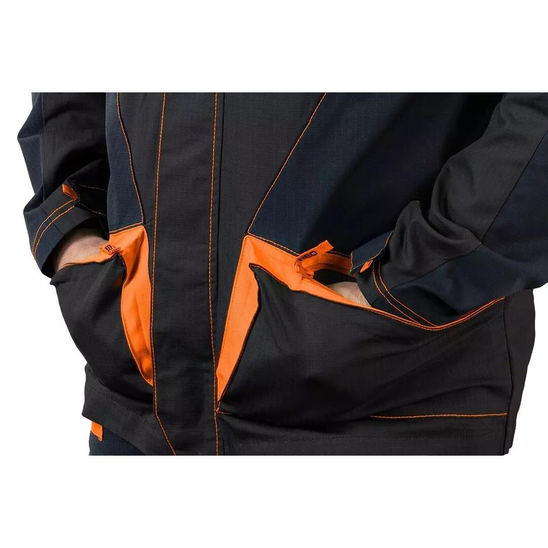 A munkakabát praktikus zsebekkel rendelkezik: két vállzseb (tollnak, zseblámpának vagy csavarhúzónak), két mellzseb (gombokkal), tágas oldalzseb (cipzárral) és két hátsó zseb (cipzárral és Oxford anyaggal megerősítve) ).