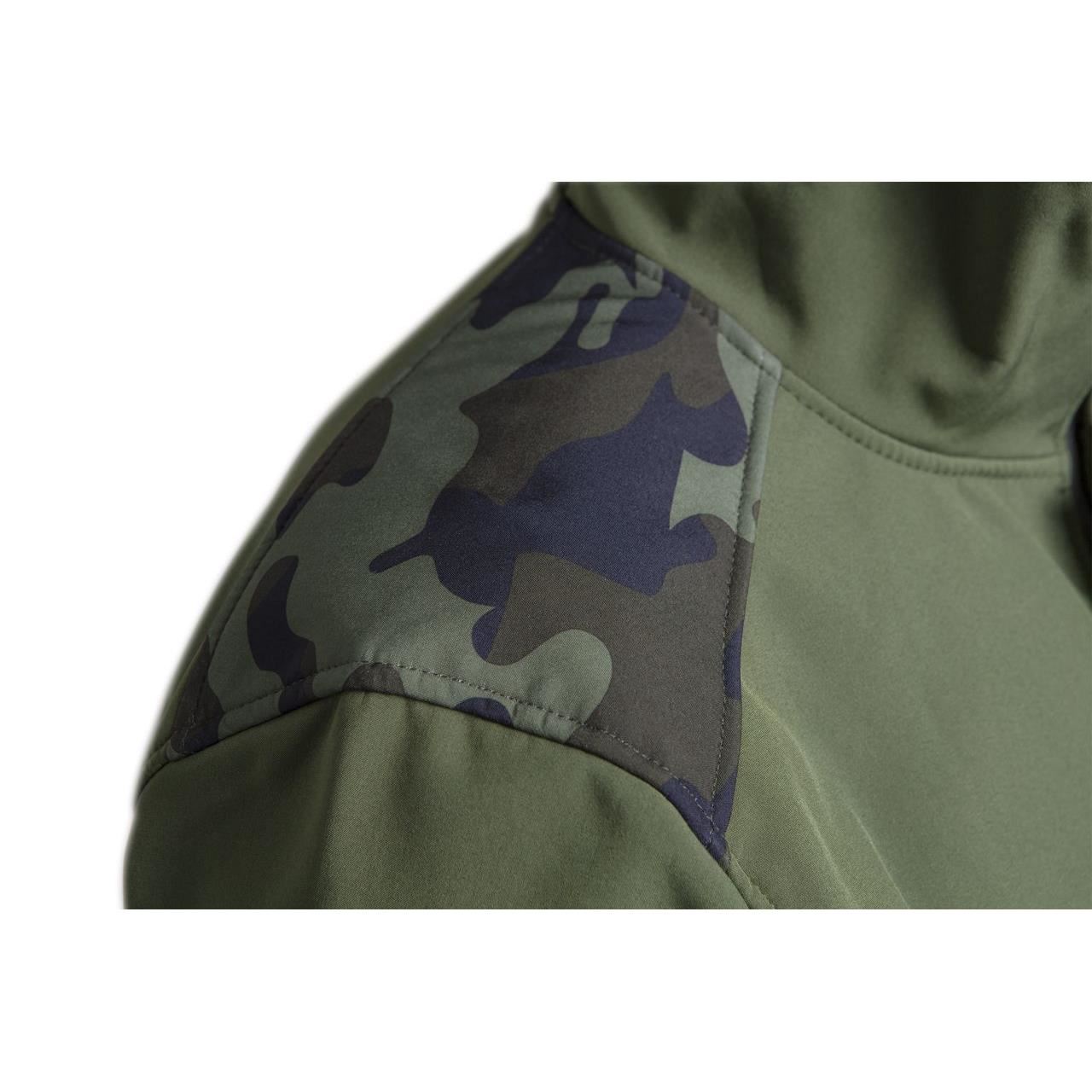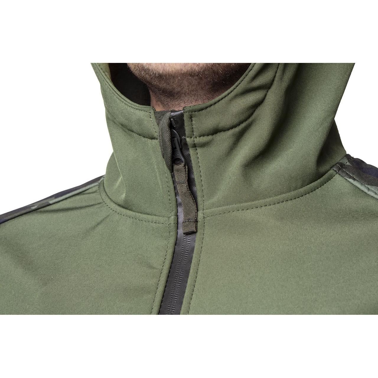 A kabátot divatos olíva szín jellemzi, egyedi terepmintás mintával és városi szabással kombinálva, amely lehetővé teszi a termék munkahelyen kívüli használatát.
