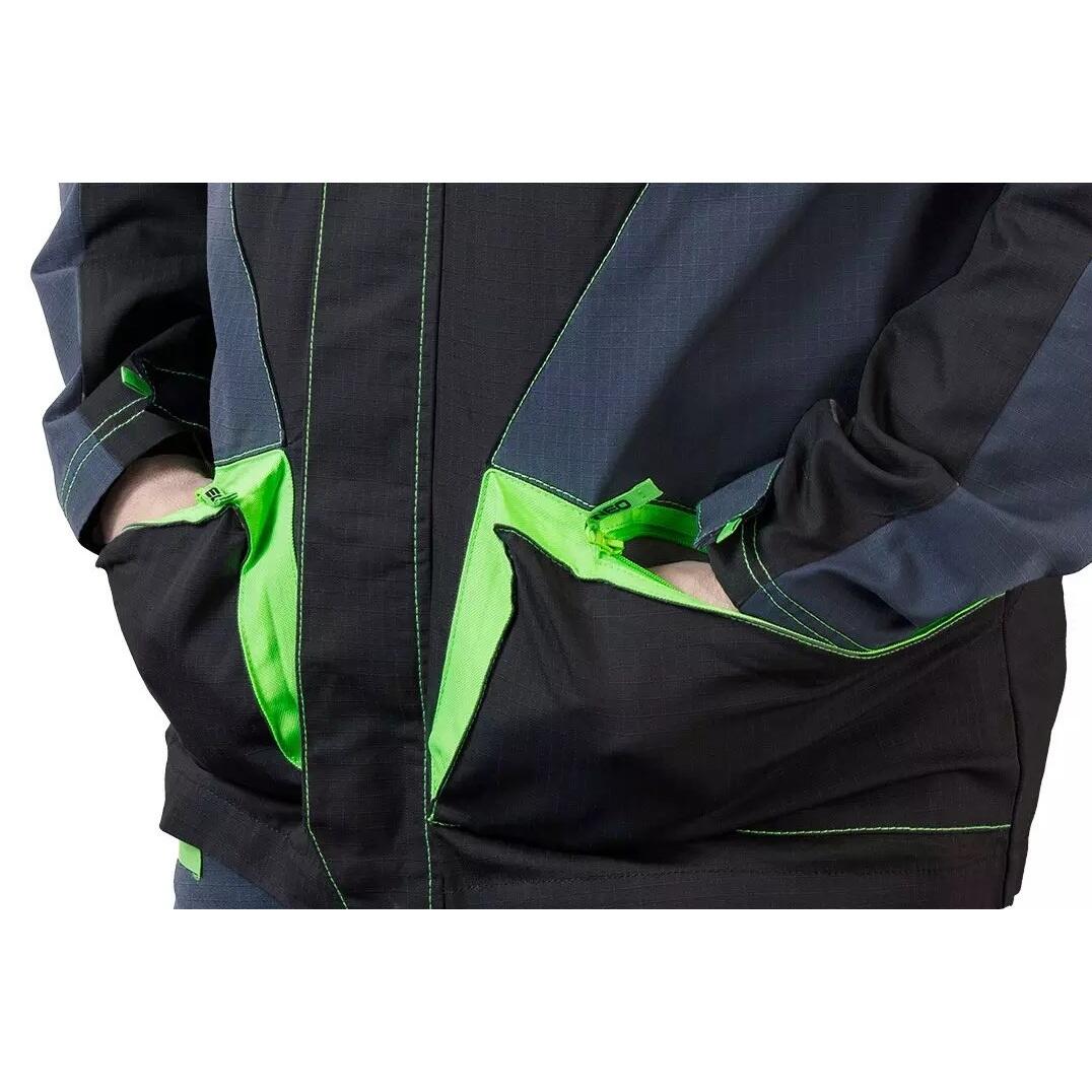 A munkakabát praktikus zsebekkel rendelkezik: két vállzseb (tollnak, zseblámpának vagy csavarhúzónak), két mellzseb (gombokkal), tágas oldalzseb (cipzárral) és két hátsó zseb (cipzárral és Oxford anyaggal megerősítve) ).