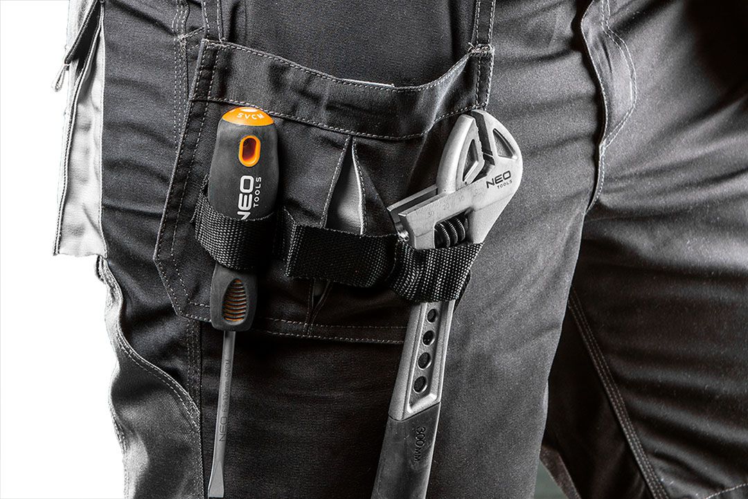 A robusztus zsebek még nagy terheket is kibírnak, és minden szükséges szerszámot elbírnak.