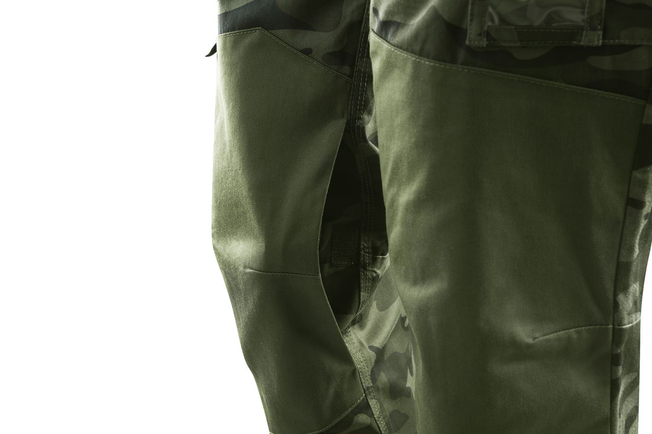A térdnél az anyag megerősített és van benne hely a munkaspecifikus térdvédők viselésére.