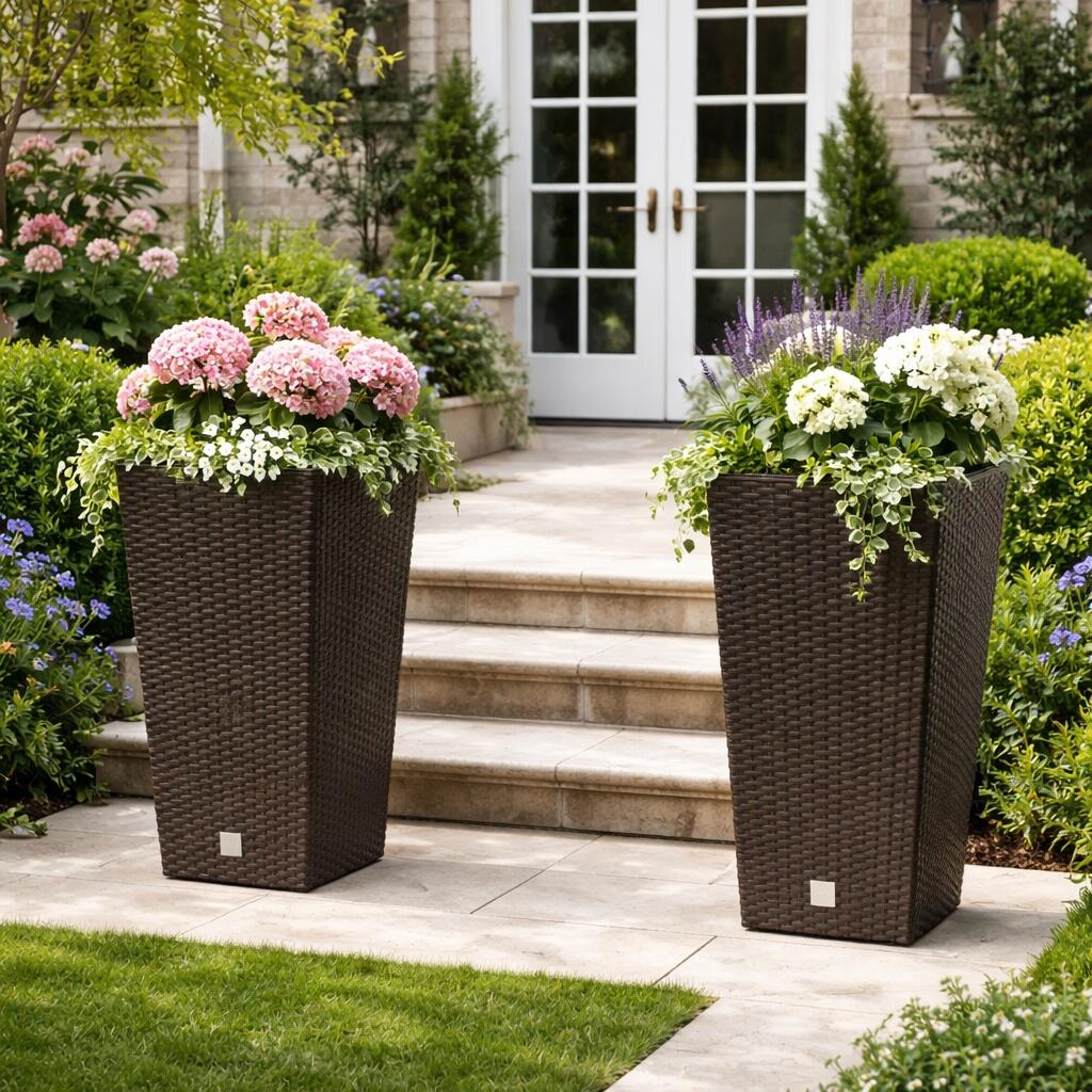 Négyzet alakú virágcserép, RATO négyzet, 32,5 x 32,5 cm, M 61 cm, 21/49 L, rattan utánzat, barna, Prosperplast