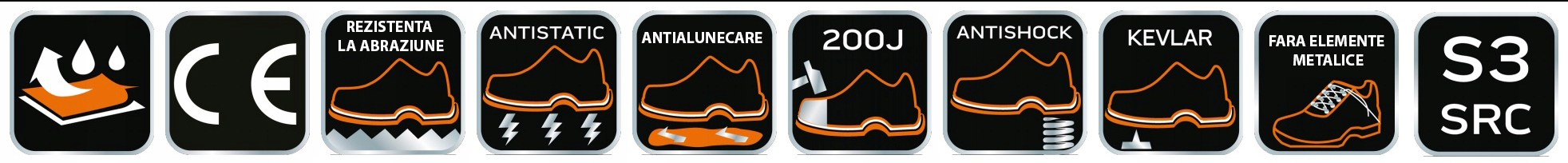 - Védelmi osztály: S3 (ütésálló orr, csúszásmentes talp, zárt saroktakaró terület, energiaelnyelés a sarok területén, antisztatikus tulajdonságok, víz behatolási és felszívódási ellenállás 60 perc, dombornyomott külső talp és behatolási ellenállás)