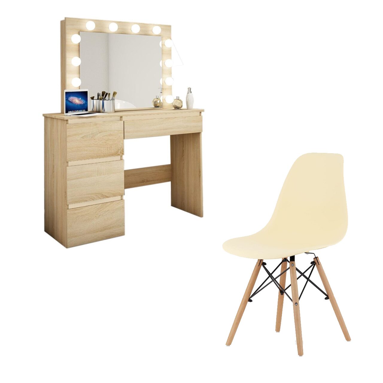 A csomag tartalmaz egy skandináv stílusú, ehhez a sminkasztalhoz megfelelő széket is!