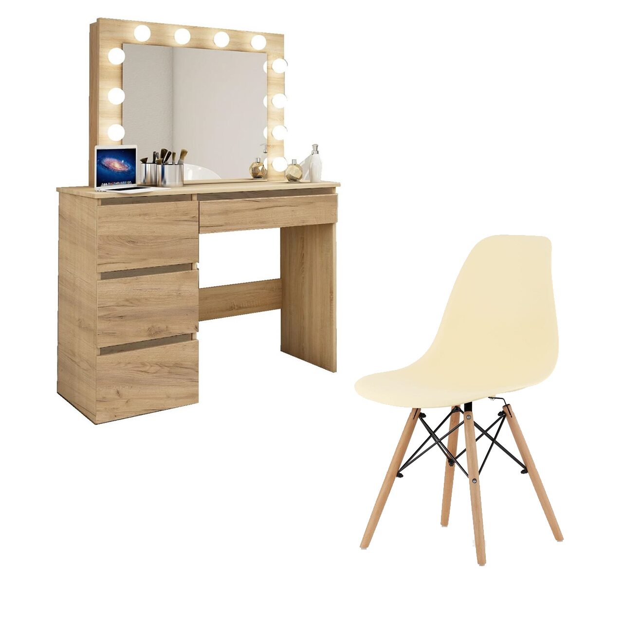 Öltöző/sminkasztal + skandináv stílusú szék, Artool, wotan tölgy, tükörrel és LED-ekkel, 94x43x141 cm