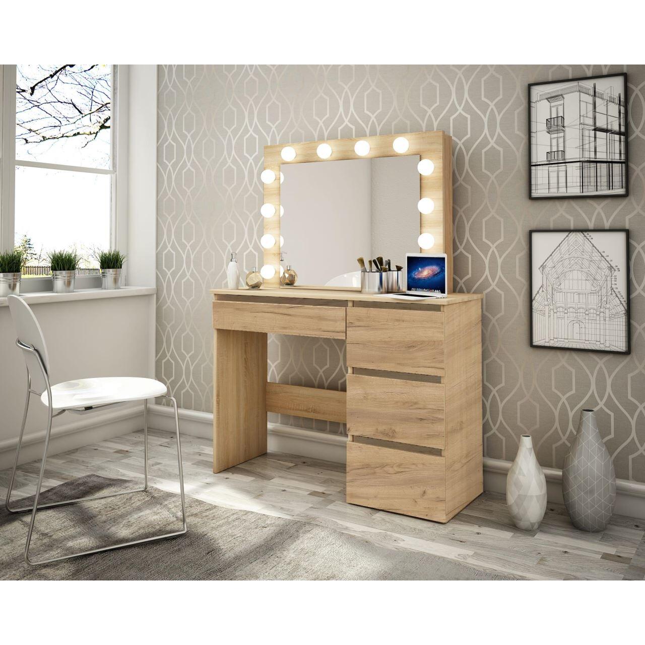 Öltöző/sminkasztal + skandináv stílusú szék, Artool, wotan tölgy, tükörrel és LED-ekkel, 94x43x141 cm