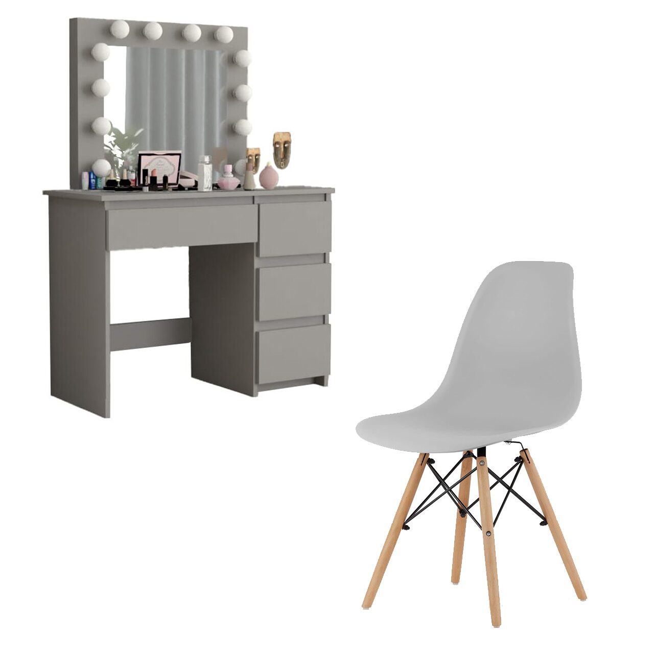 Öltöző/sminkasztal + skandináv stílusú szék, szürke, tükörrel és LED-ekkel, 94x43x141 cm
