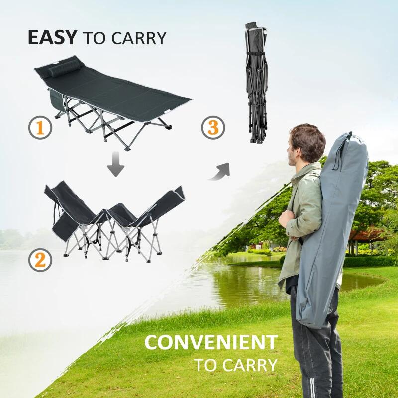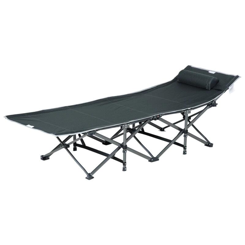 Összecsukható ágyas kemping, kert, horgászat, Oxford anyagú, oldalzsebbel, fejtámlával, táskával, szürke, max 150 kg, 188x64,5x53 cm