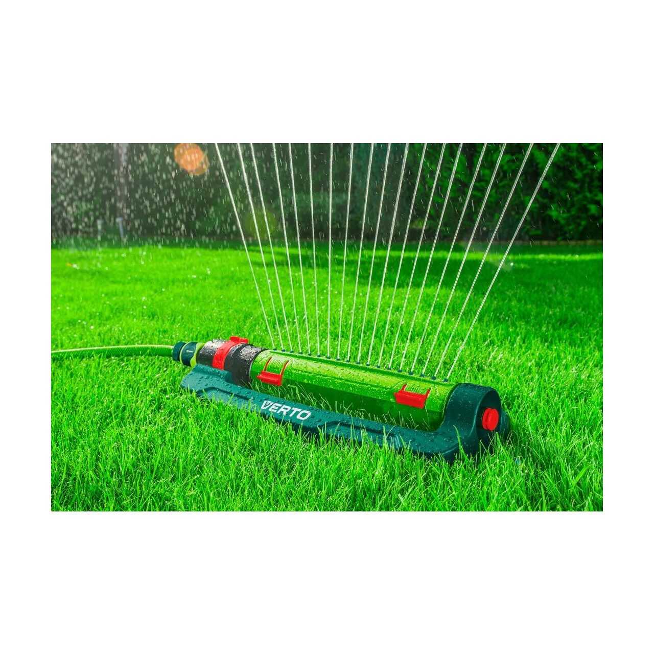 Oszcilláló sprinkler VERTO 1/2 " -3/4 " ;. Törésnek és tönkremenetelnek ellenálló anyagból készült, és akár 418 m2-es felületek öntözését teszi lehetővé. 18 téglalap alakú vízsugárral rendelkezik. Az öntözési intervallum egyszerűen beállítható a locsológéppel. Tartalmaz egy tűt a fúvókák tisztításához.