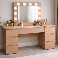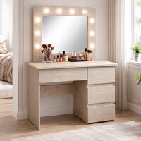 Sminkasztal, 2 bal fiókos, tükörrel, szekrénnyel, fehér és tölgy, 90x50x77/142 cm