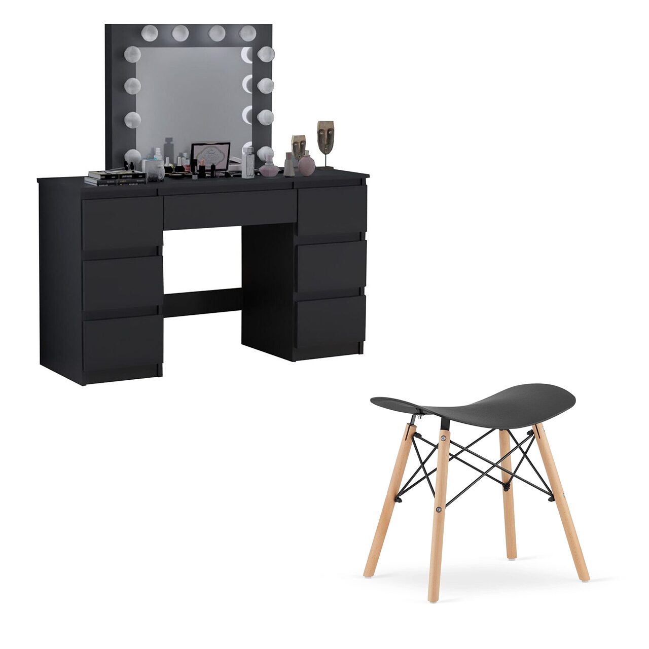 pipere/sminkasztal + korfui szék, fekete, tükörrel és LED-ekkel, Vanessa, 130x43x143 cm