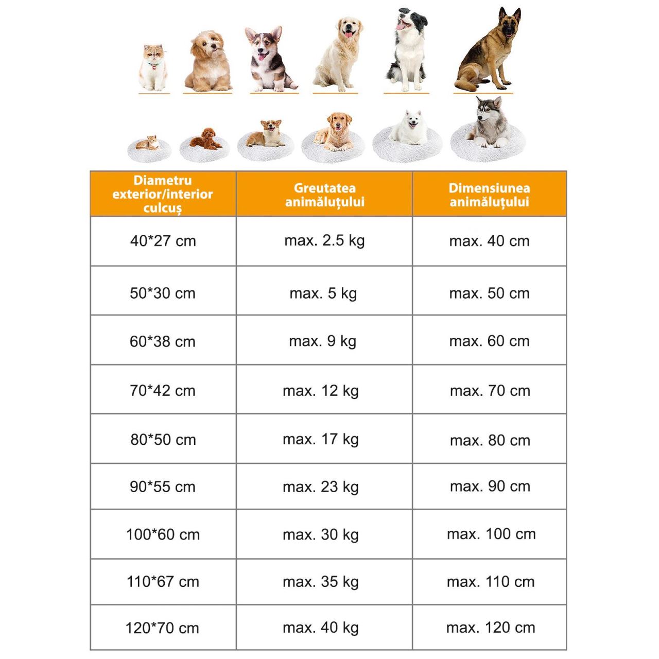 Elérhető méretopciók – Tekintse meg az alábbi táblázatot, hogy megtalálja kedvence számára a megfelelő ágyat. Vegye figyelembe mind a külső, mind a belső átmérőt.