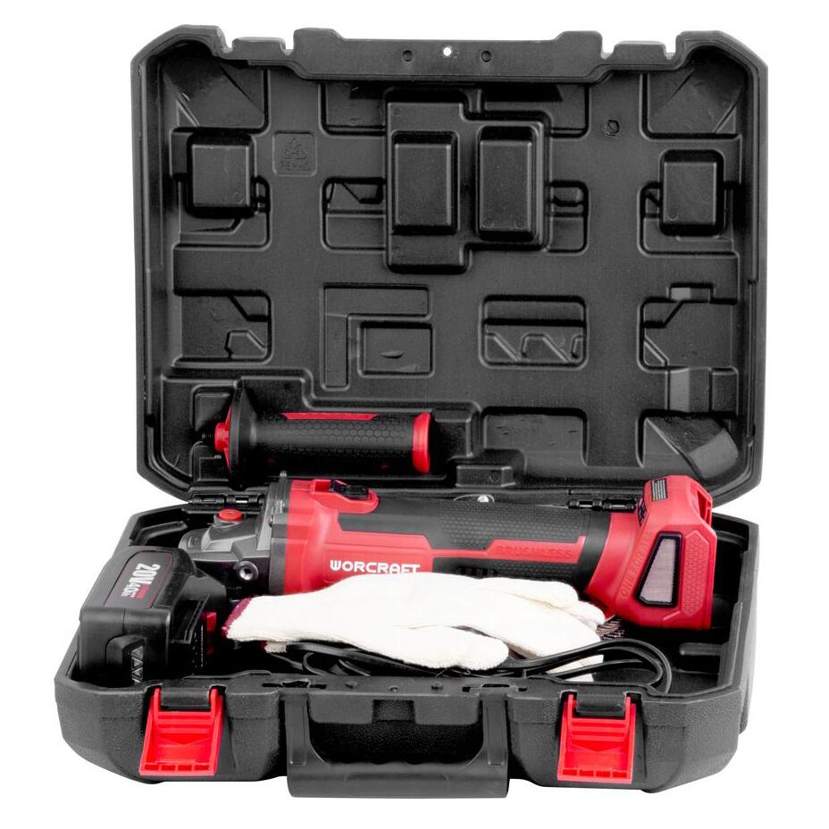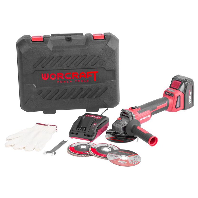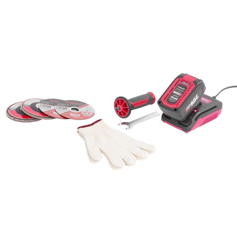 Sarokcsiszoló, flex, 4 Ah akkumulátorral, 20 V-os Li-ion töltővel, táskával, 4 tárcsával, kesztyűvel, 115 mm, Warcraft
