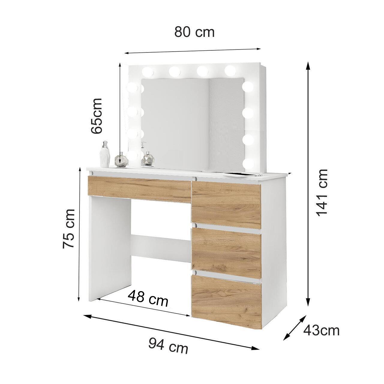 Sminkasztal, fehér és Wotan tölgy, tükörrel és LED-ekkel, Irina, 94x43x141 cm