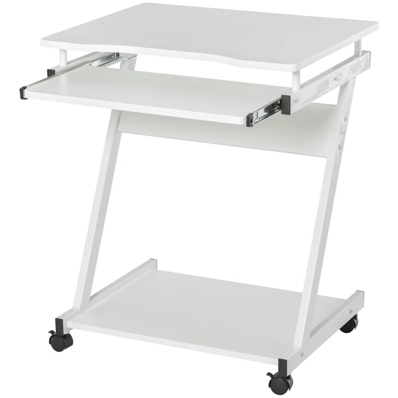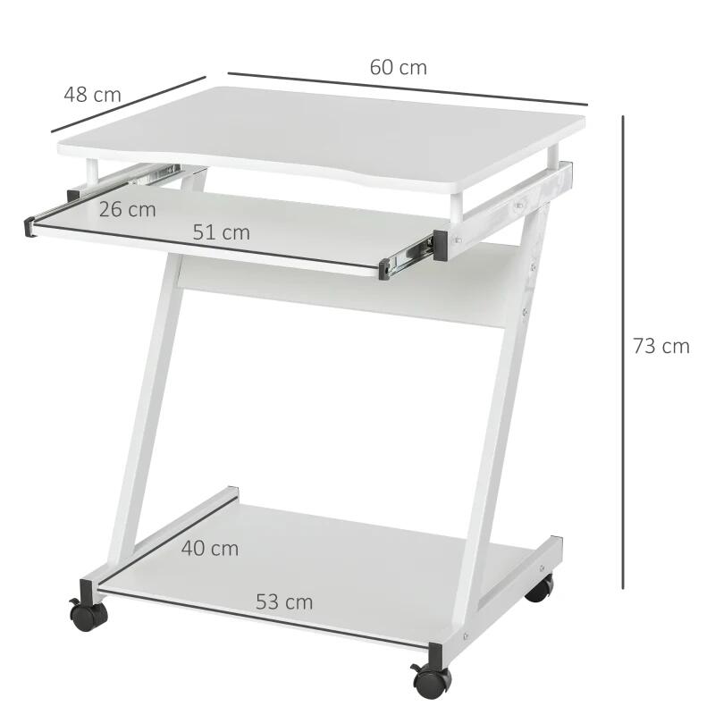 Számítógép asztal, kerekeken, fém, fakó, billentyűzetes polccal, fehér, max 30 kg, 60x48x73 cm
