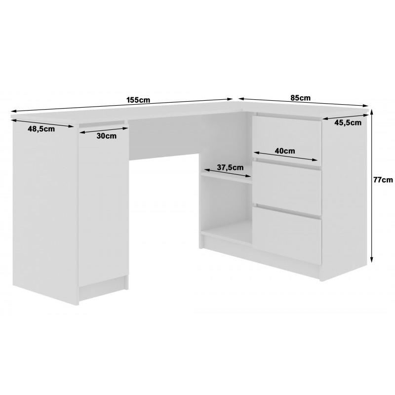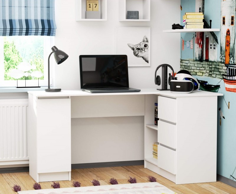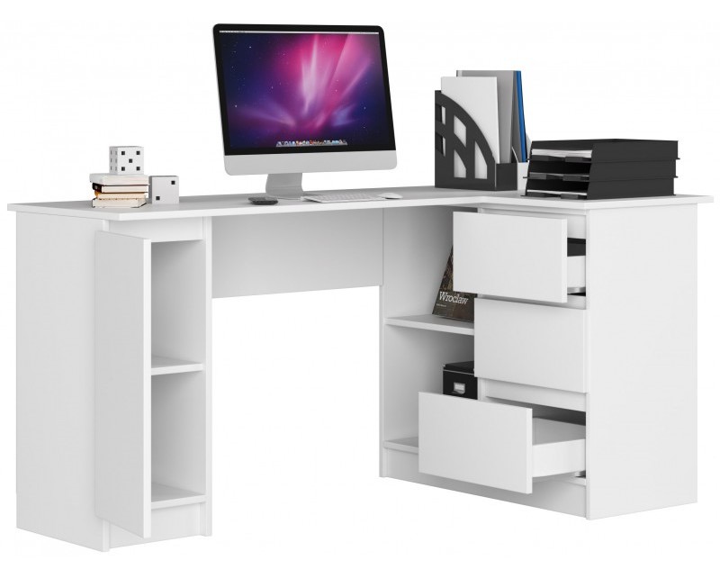 Számítógép asztal sarkon, laminált lap, 3 fiók, 4 polc, fehér, 155x85x77 cm
