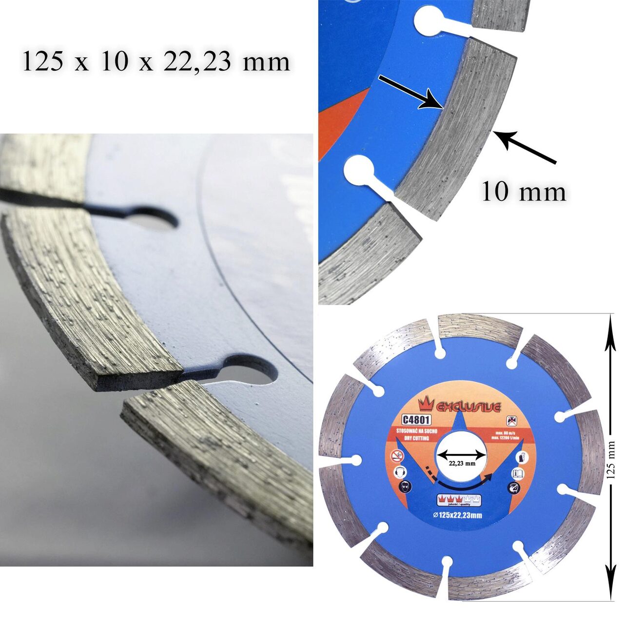 A tárcsa átmérője 125 mm, vastagsága 2,0 mm, belső átmérője 22,23 mm, gyémánt felülete 10 mm.