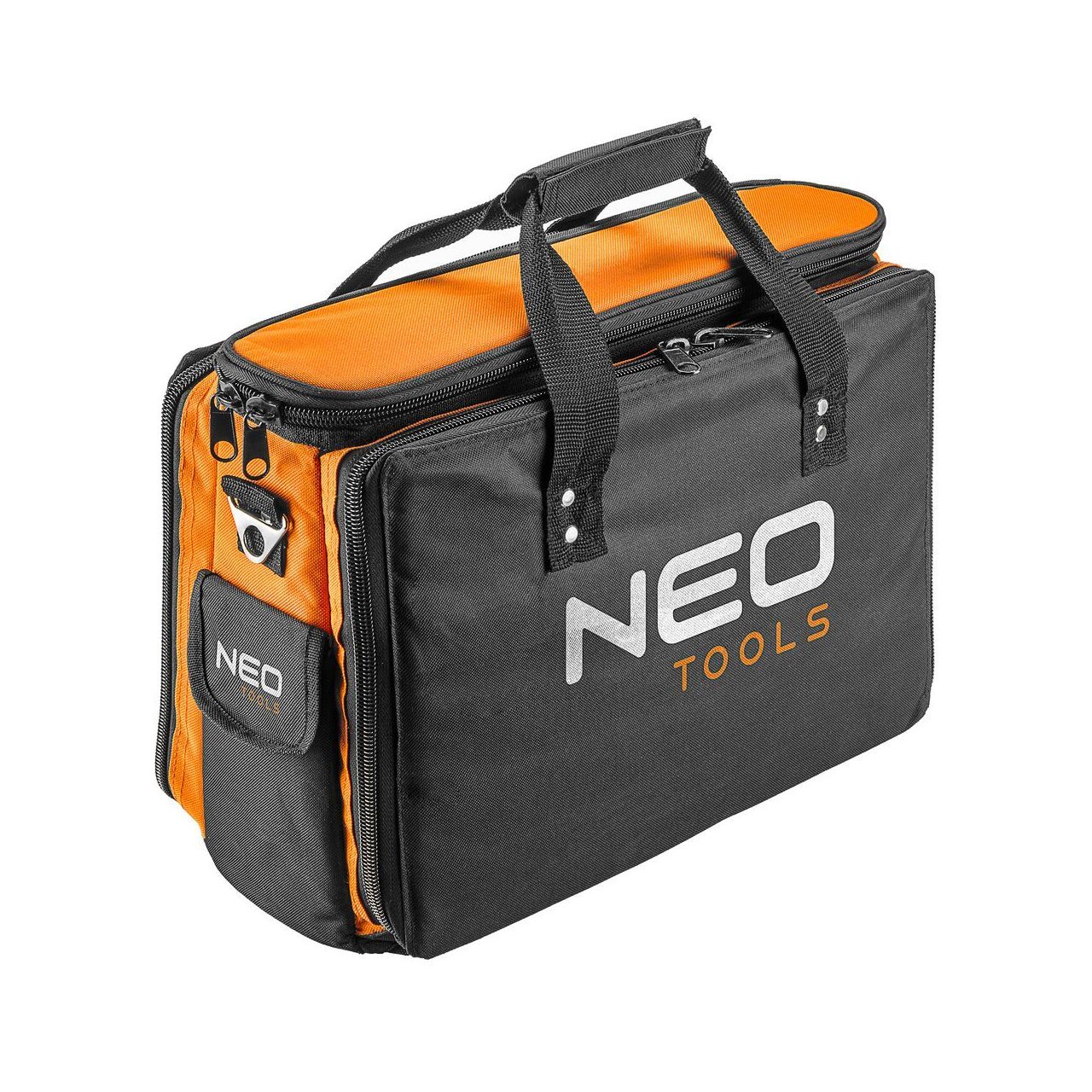 A NEO szerszámtáska 600 D tartós poliészterből készült, amely garantálja a termék hosszú élettartamát. A táska merevített aljú támasztékokkal rendelkezik, amelyek védik a tartalmát nehéz körülmények között végzett munka során. A szerszámtáska erős fogantyúval és hordszíjjal rendelkezik.