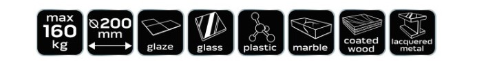 A maximális emelési súly 160 kg. Vákuumszivattyúval van felszerelve a szilárdabb fogás érdekében és gombbal a gyors kioldáshoz.
