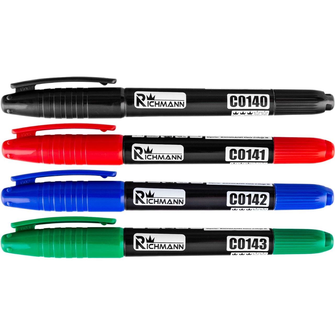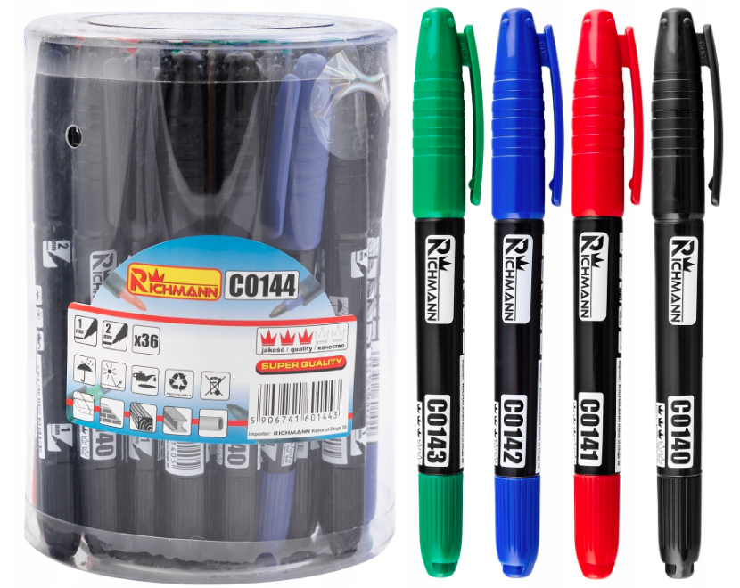 Tartós vékony marker, 2 fej, 4 szín, 36 db-os készlet, RICHMANN Tartós marker  -hez; minden felületre, beleértve a műanyagot, fémet és üveget is. 36 db-os készlet. (fekete, zöld, piros, kék...