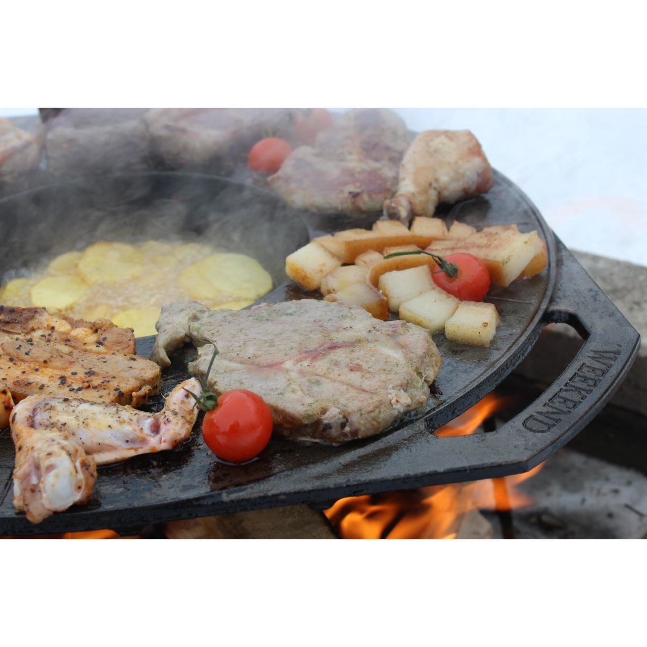 Az öntöttvas grilltárcsa ideális a szabadban történő ételek főzéséhez.