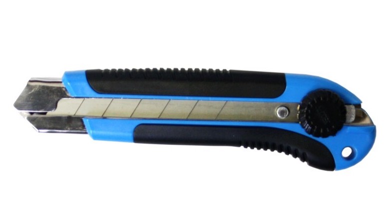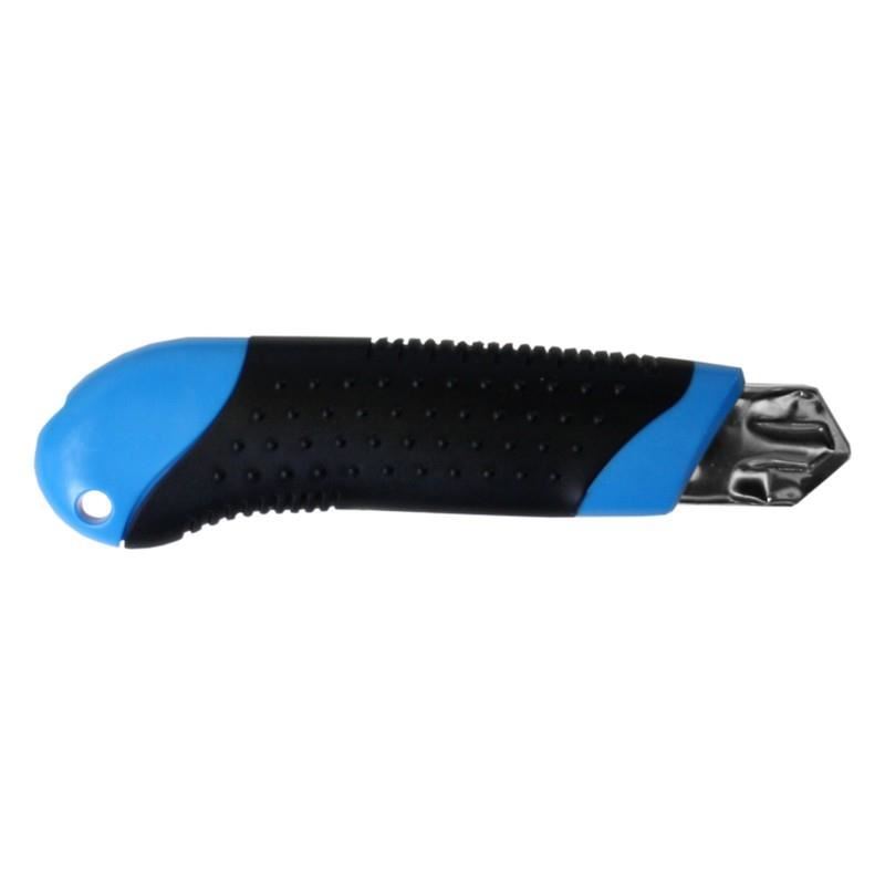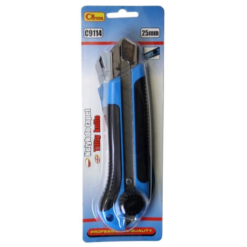 Univerzális kés  -vel; 25 mm széles cserélhető pengék, acél test, ergonomikus műanyag fogantyú  -vel; csúszásmentes gumi, forgóütköző pengezár.