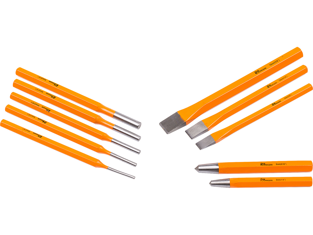 Vésőkészlet kiváló minőségű anyagból, króm-vanádium acél (Cr-V), krómozott a korrózió megelőzésére, polírozott a könnyű tisztítás érdekében, profiknak készült.